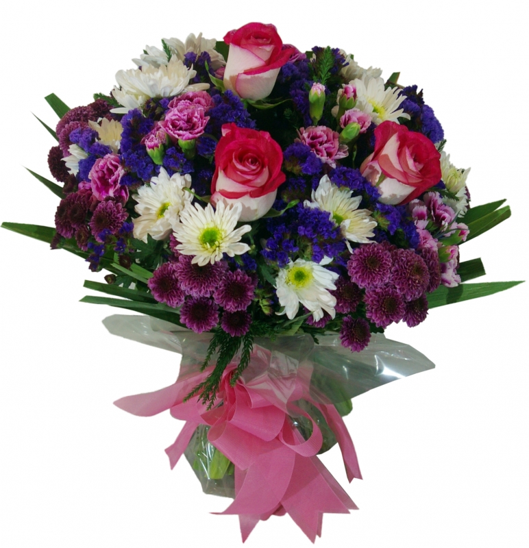 Spring bouquet with roses, chrysanthemums, cloves and statis