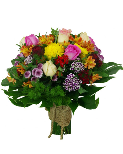 Bouquet with roses, Alstroemeria and chrysanthemums decorated with hemp