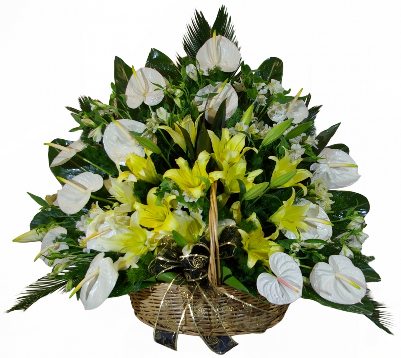 | One-sided wicker basket with anthurium, lilium and Alstroemeria flowers