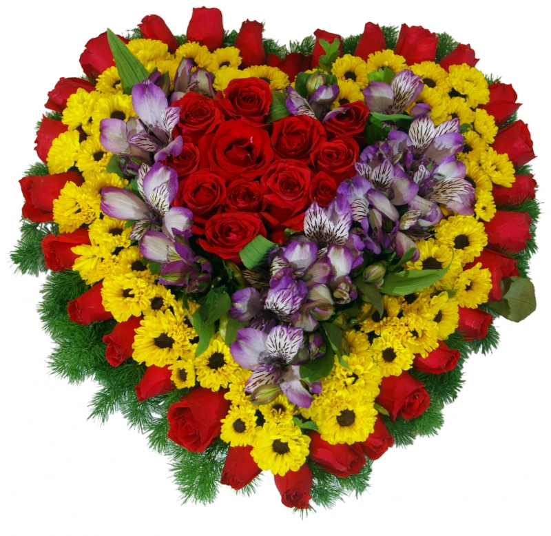 | Heart-shaped basket with roses, Alstroemeria and chrysanthemums
