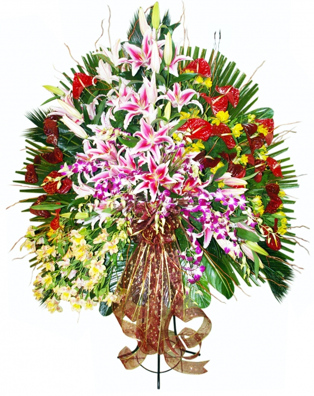 | Metal base with anthurium, lilium and Alstroemeria flowers
